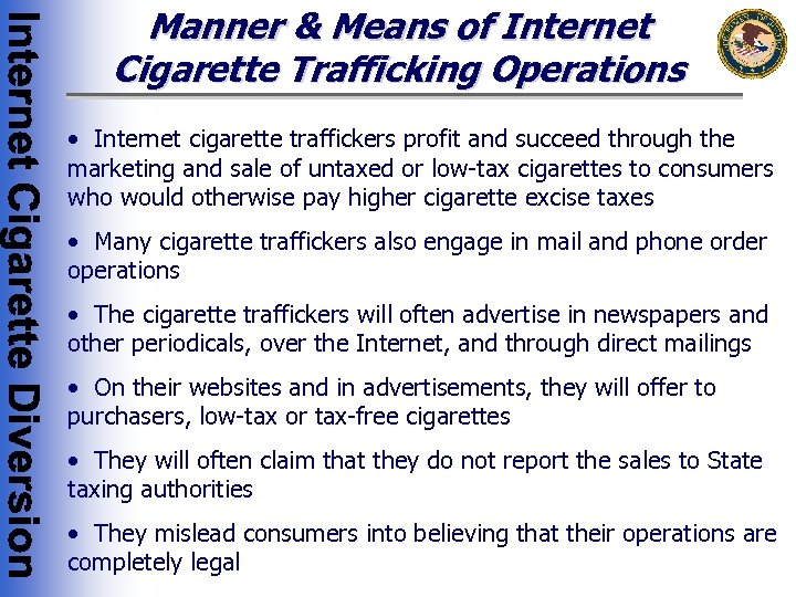 Manner & Means of Internet Cigarette Trafficking Operations • Internet cigarette traffickers profit and succeed through the marketing and sale of untaxed or low-tax cigarettes to consumers who would otherwise pay higher cigarette excise taxes • Many cigarette traffickers also engage in mail and phone order operations • The cigarette traffickers will often advertise in newspapers and other periodicals, over the Internet, and through direct mailings • On their websites and in advertisements, they will offer to purchasers, low-tax or tax-free cigarettes • They will often claim that they do not report the sales to State taxing authorities • They mislead consumers into believing that their operations are completely legal