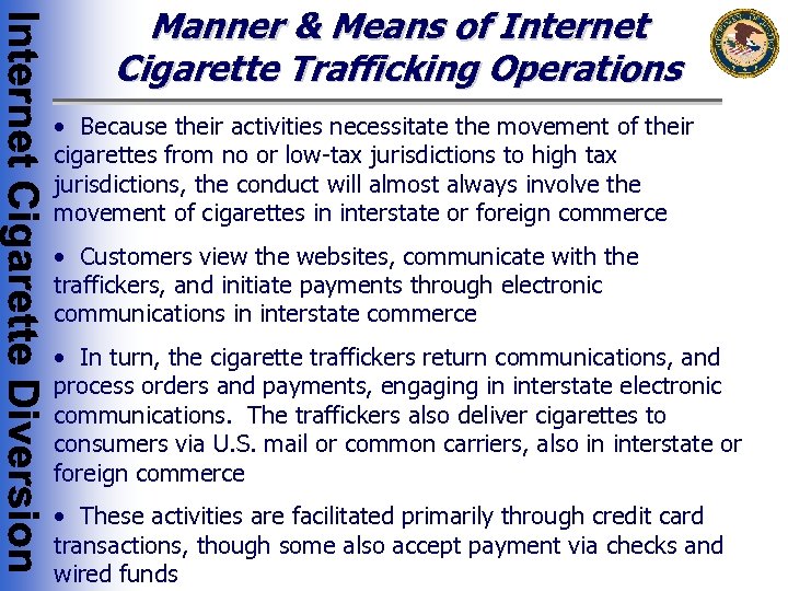 Manner & Means of Internet Cigarette Trafficking Operations • Because their activities necessitate the movement of their cigarettes from no or low-tax jurisdictions to high tax jurisdictions, the conduct will almost always involve the movement of cigarettes in interstate or foreign commerce • Customers view the websites, communicate with the traffickers, and initiate payments through electronic communications in interstate commerce • In turn, the cigarette traffickers return communications, and process orders and payments, engaging in interstate electronic communications. The traffickers also deliver cigarettes to consumers via U. S. mail or common carriers, also in interstate or foreign commerce • These activities are facilitated primarily through credit card transactions, though some also accept payment via checks and wired funds