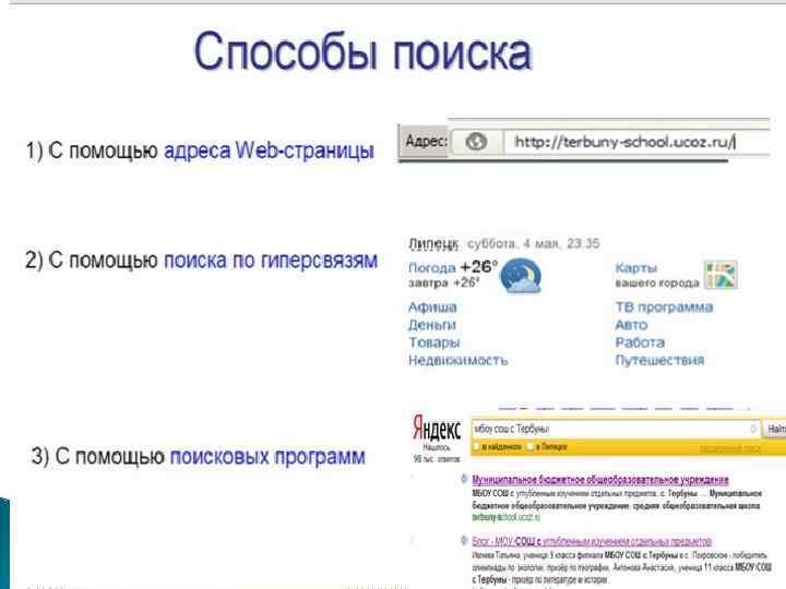 Браузер — клиент-программа для работы пользователя с WWW. Перемещаться по «паутине» пользователю помогает специальное программное обеспечение, которое называется Webбраузером (Opera, Mozila), от английского слова «browse» — осматривать, изучать. Хорошими помощниками в навигации по WWW являются специальные поисковые серверы (Яndex, Rambler). Киберпространство — совокупность мировых систем телекоммуникаций и циркулирующей в них информации