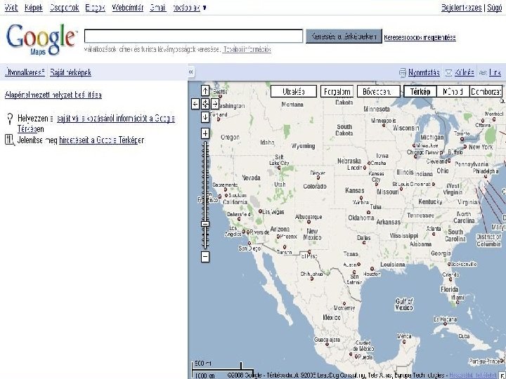 Maps n n n 2005. február 8. -án jelentette meg a Google ingyenes online térképszolgáltatását, a mindmáig béta Google Maps-et. Induláskor a szolgáltatás csak az USA, Kanada, az Egyesült Királyság és Írország területét fedte le. Az online térkép egérrel megragadható és mozgatható, lehet benne helynév szerint keresni, és részletes útbaigazítást is tud adni. Igen gyorsan működik, mivel a térképek előre le vannak renderelve. Jelenleg a következő böngészőket támogatja: Internet Explorer, Mozillaalapú böngészők, az Opera és a Safari. 2005. április 4 -étől a Google Maps-nek műholdfelvételes nézete is van. Ez kezdetben csak Észak-Amerikára és az Egyesült Királyságra korlátozódott, majd 2005 júniusától az egész földre kiterjesztették. A szolgáltatás magyar nyelven is elérhető. http: //maps. google. com/
