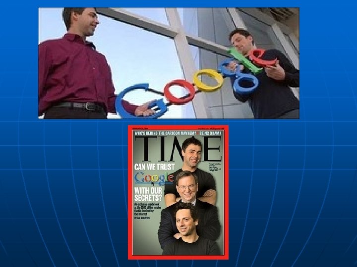 A Google története n n n A Google vállalat alapítói: Larry Page és Sergey Brin. 1995 ben, a Stanford egyetem végzősei. 1998 -ra eladható szintre fejlesztették a Google technológiát. Larry kollégiumi szobáját irodának rendezték be, és onnan próbálták értékesíteni rendszerüket - kevés sikerrel. Egy évre rá a cég átköltözött második telephelyére, nyolc főt számlált, a Google program pedig napi 500 ezer keresésért volt felelős. 2000 -ben a Google lett a legnagyobb keresőmotor. 2004 -ben a Google vállalat első negyedévi jövedelme elérte a 805. 9 millió dollárt.