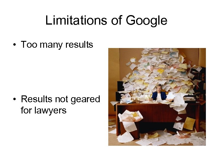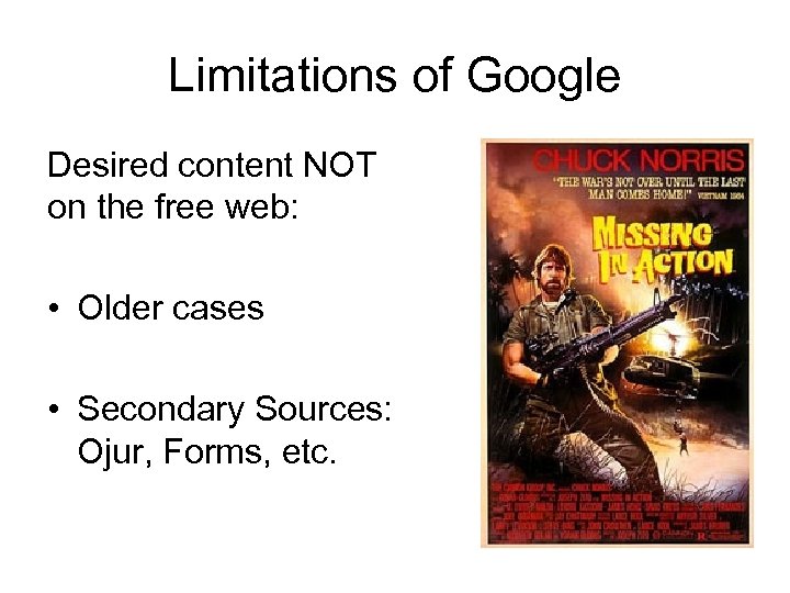 Limitations of Google Desired content NOT on the free web: • Older cases • Secondary Sources: Ojur, Forms, etc.