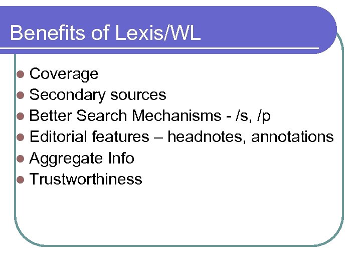 Benefits of Lexis/WL l Coverage l Secondary sources l Better Search Mechanisms - /s, /p l Editorial features – headnotes, annotations l Aggregate Info l Trustworthiness