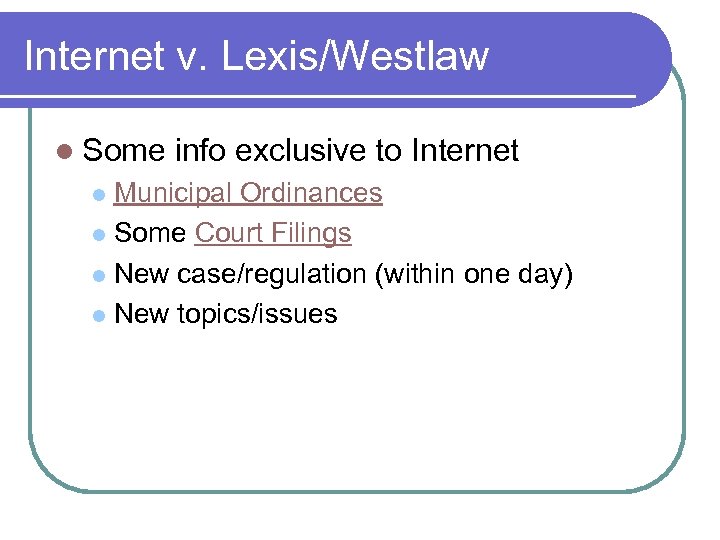 Internet v. Lexis/Westlaw l Some info exclusive to Internet Municipal Ordinances l Some Court Filings l New case/regulation (within one day) l New topics/issues l