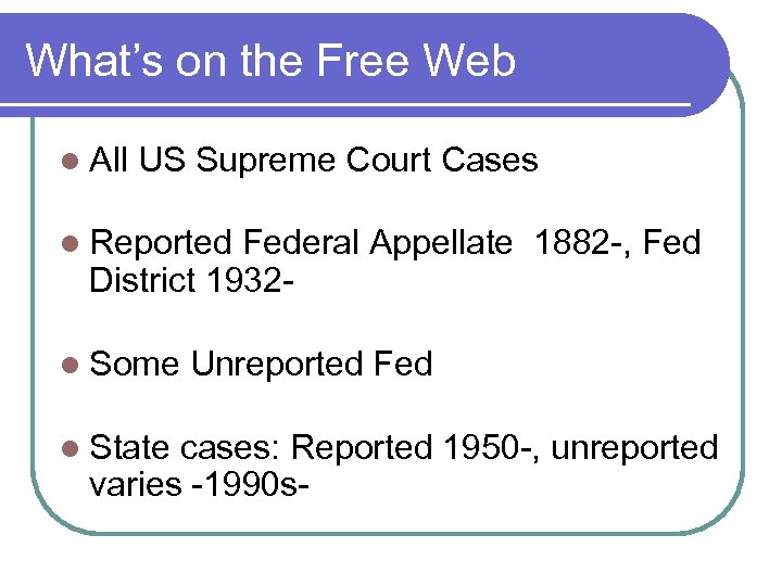 What’s on the Free Web l All US Supreme Court Cases l Reported Federal Appellate 1882 -, Fed District 1932 - l Some Unreported Fed l State cases: Reported 1950 -, unreported varies -1990 s-