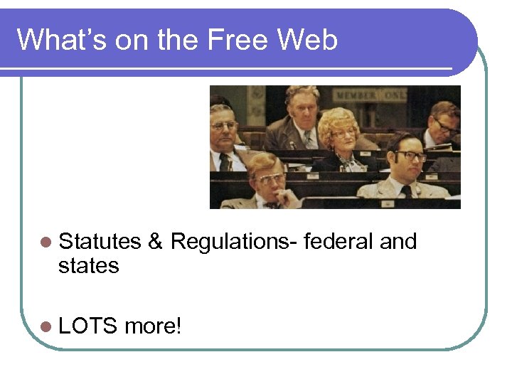 What’s on the Free Web l Statutes & Regulations- federal and states l LOTS more!
