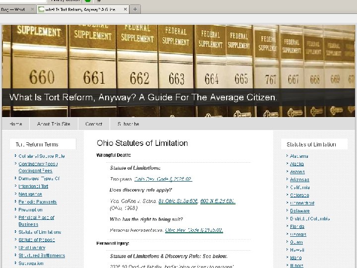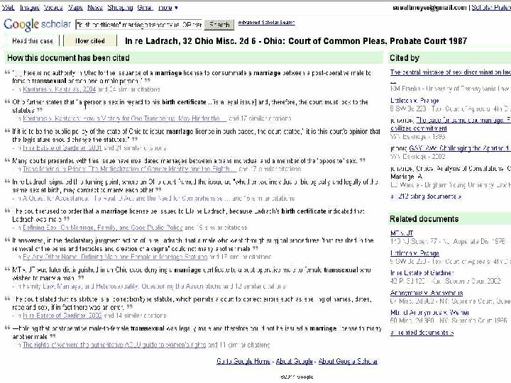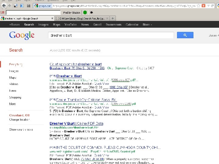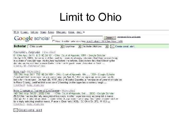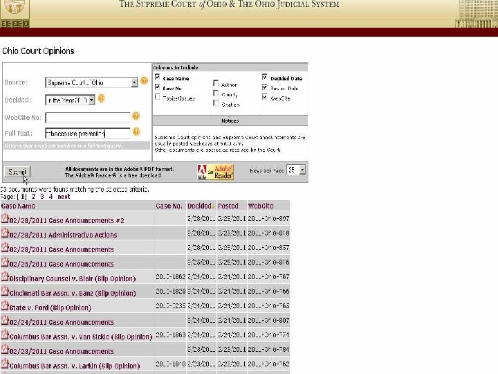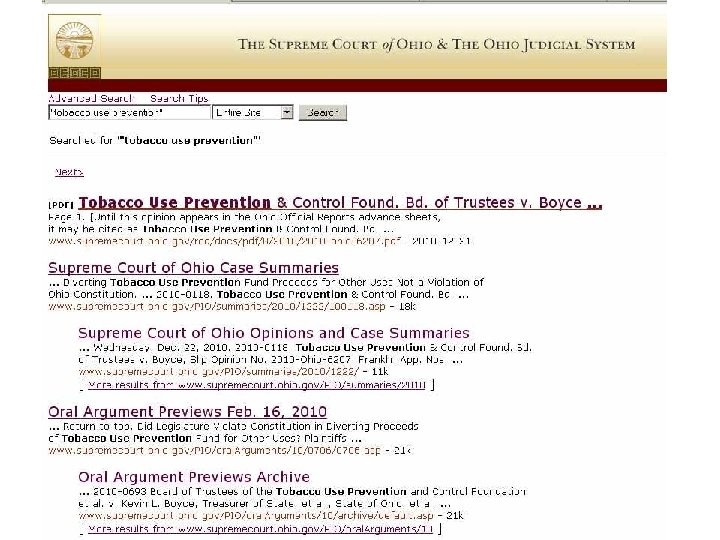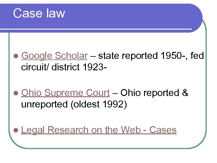 Case law l Google Scholar – state reported 1950 -, fed circuit/ district 1923 l Ohio Supreme Court – Ohio reported & unreported (oldest 1992) l Legal Research on the Web - Cases