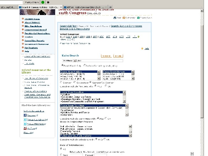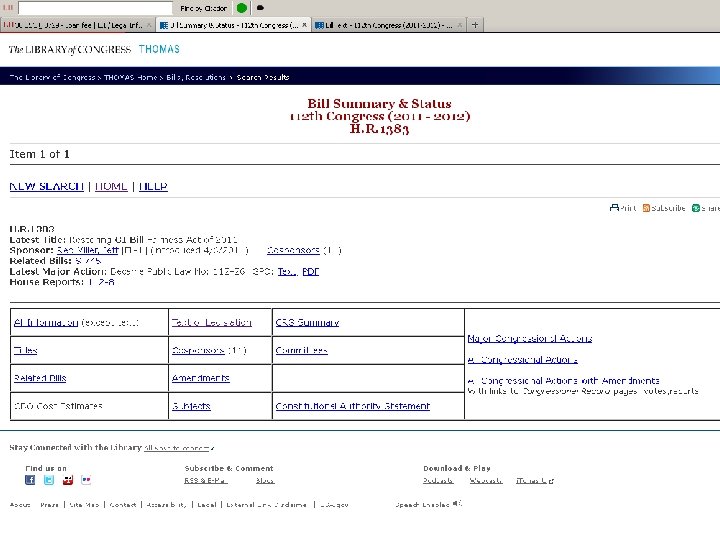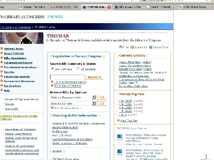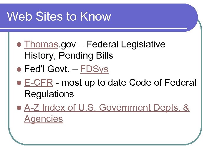 Web Sites to Know l Thomas. gov – Federal Legislative History, Pending Bills l Fed’l Govt. – FDSys l E-CFR - most up to date Code of Federal Regulations l A-Z Index of U. S. Government Depts. & Agencies