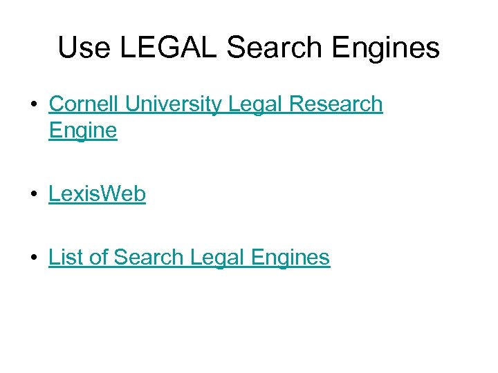 Use LEGAL Search Engines • Cornell University Legal Research Engine • Lexis. Web • List of Search Legal Engines