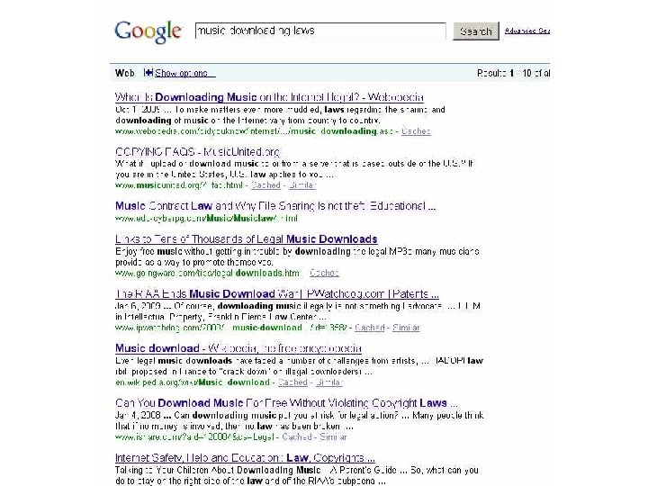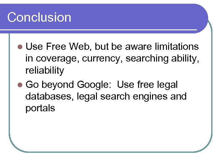 Conclusion l Use Free Web, but be aware limitations in coverage, currency, searching ability, reliability l Go beyond Google: Use free legal databases, legal search engines and portals