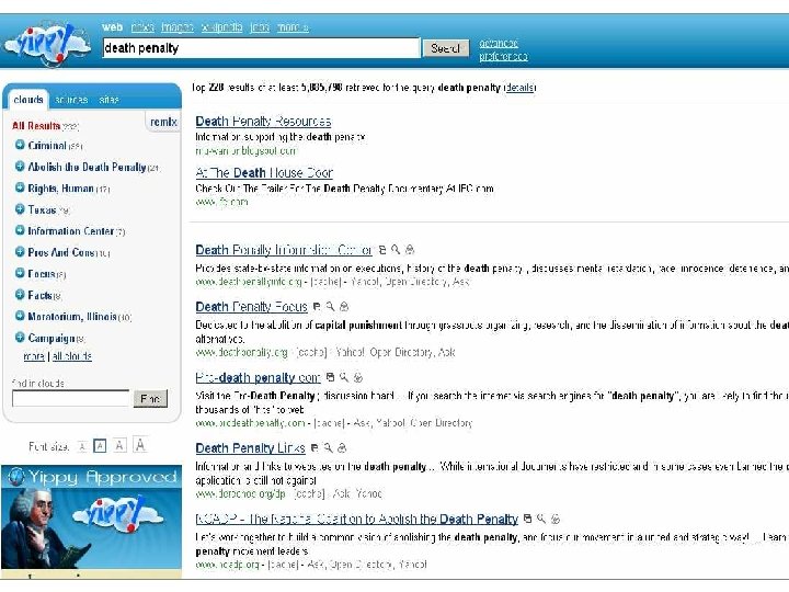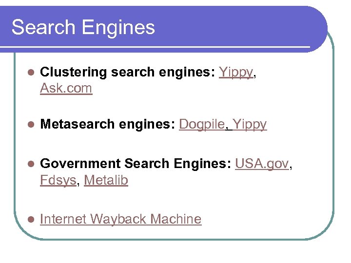 Search Engines l Clustering search engines: Yippy, Ask. com l Metasearch engines: Dogpile, Yippy l Government Search Engines: USA. gov, Fdsys, Metalib l Internet Wayback Machine