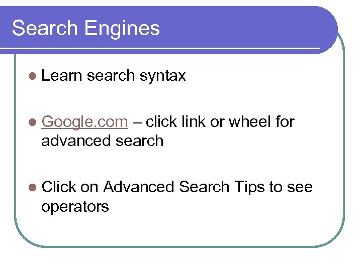 Search Engines l Learn search syntax l Google. com – click link or wheel for advanced search l Click on Advanced Search Tips to see operators