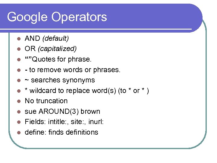 Google Operators l l l l l AND (default) OR (capitalized) “”Quotes for phrase. - to remove words or phrases. ~ searches synonyms * wildcard to replace word(s) (to * or * ) No truncation sue AROUND(3) brown Fields: intitle: , site: , inurl: define: finds definitions