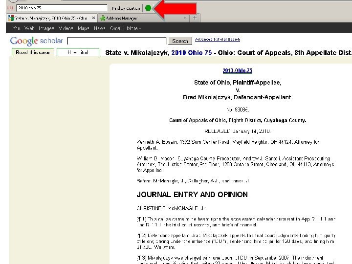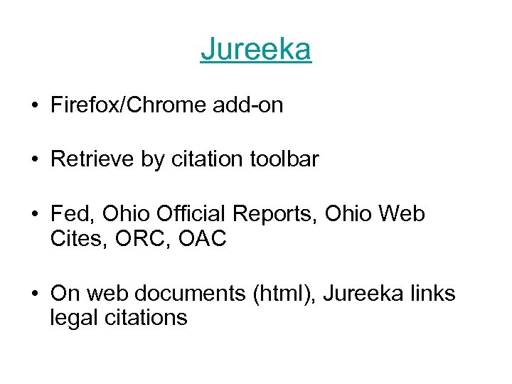 Jureeka • Firefox/Chrome add-on • Retrieve by citation toolbar • Fed, Ohio Official Reports, Ohio Web Cites, ORC, OAC • On web documents (html), Jureeka links legal citations
