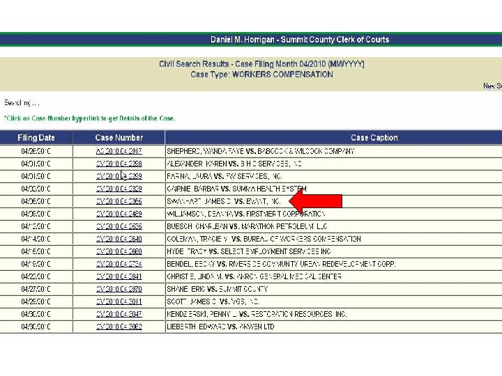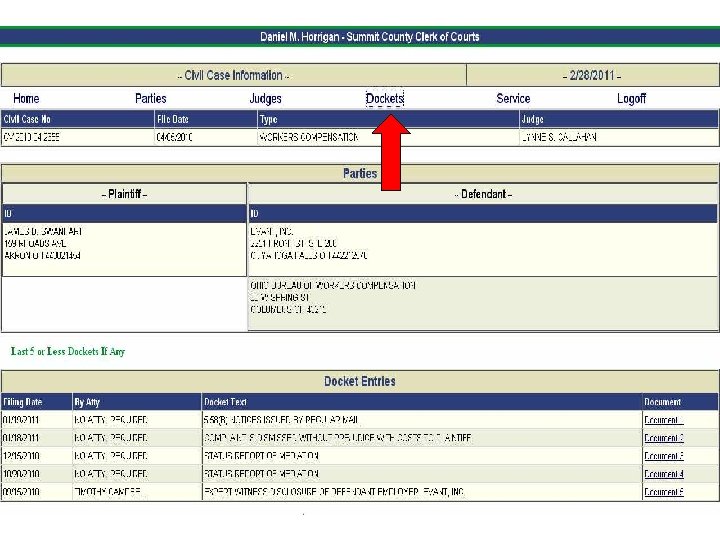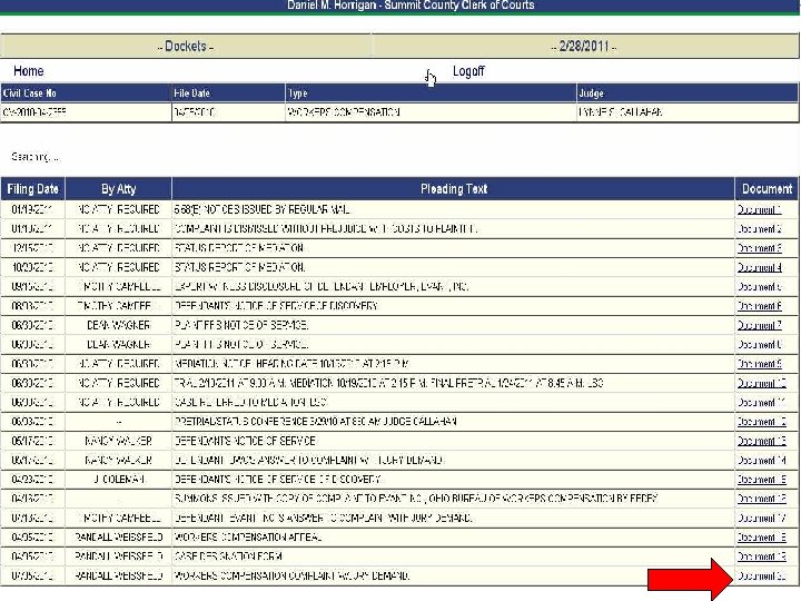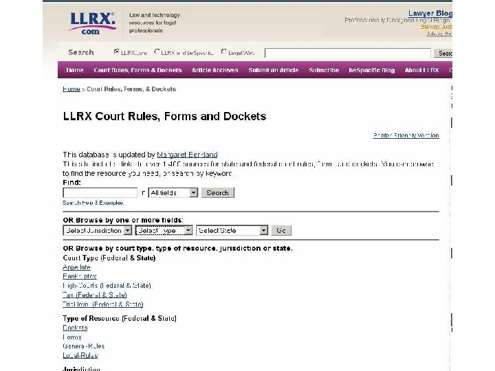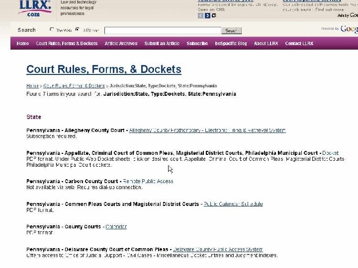 Finding Dockets, Pleadings, Motions l LLRX or Resources for Online Court Dockets to find dockets l Some dockets have full text documents ex. Ohio – Montgomery & Summit Counties, federal l PACER – Federal Court dockets l On Westlaw/Lexis – more search capability