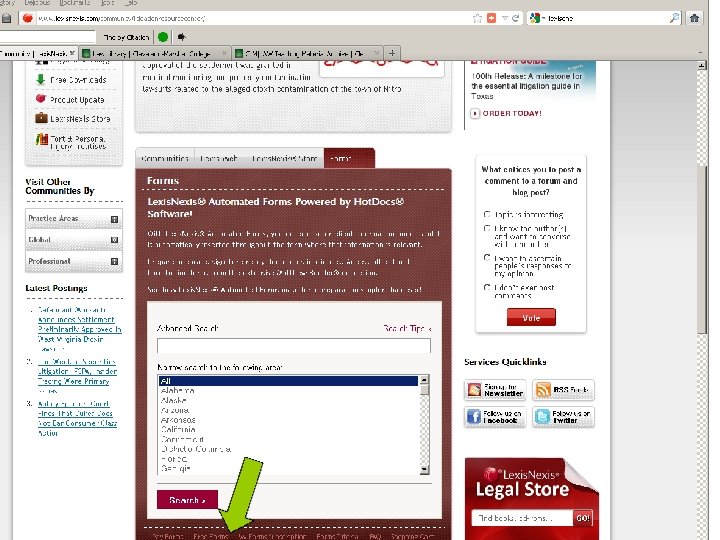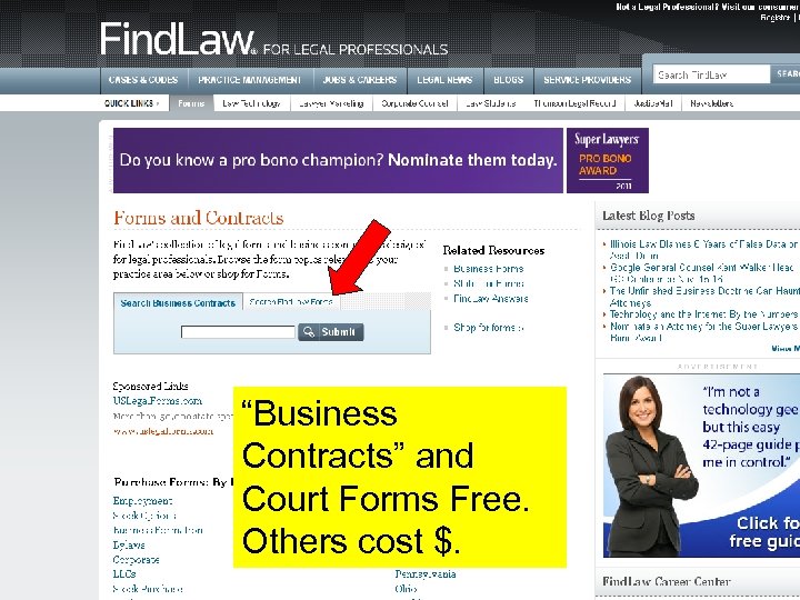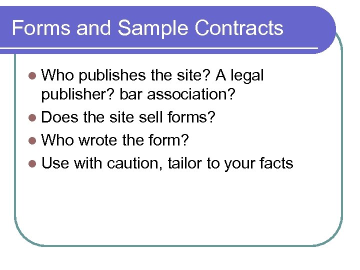 Forms and Sample Contracts l Who publishes the site? A legal publisher? bar association? l Does the site sell forms? l Who wrote the form? l Use with caution, tailor to your facts