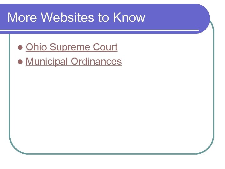More Websites to Know l Ohio Supreme Court l Municipal Ordinances