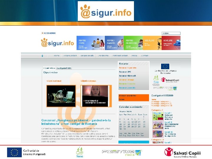 • Save the Children, Positive Media and Romanian Center for Missing and Sexually Exploited Children in 2007 initiated a consortium project to develop multi Sigur. Info within the European Union program to promote use of safer conditions, the Internet site and new online technologies (Safer Internet Plus). Save the Children is the national coordinator of the project "Sigur. info. From 2007 until 2010 were carried out thousands of information to parents, children, teachers in schools in Romania and outside