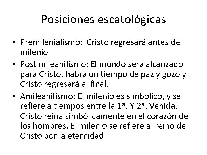 Posiciones escatológicas • Premilenialismo: Cristo regresará antes del milenio • Post mileanilismo: El mundo será alcanzado para Cristo, habrá un tiempo de paz y gozo y Cristo regresará al final. • Amileanilismo: El milenio es simbólico, y se refiere a tiempos entre la 1ª. Y 2ª. Venida. Cristo reina simbólicamente en el corazón de los hombres. El milenio se refiere al reino de Cristo por la eternidad