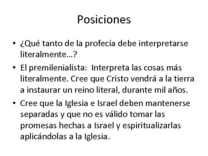 Posiciones • ¿Qué tanto de la profecía debe interpretarse literalmente…? • El premilenialista: Interpreta las cosas más literalmente. Cree que Cristo vendrá a la tierra a instaurar un reino literal, durante mil años. • Cree que la Iglesia e Israel deben mantenerse separadas y que no es válido tomar las promesas hechas a Israel y espiritualizarlas aplicándolas a la Iglesia.