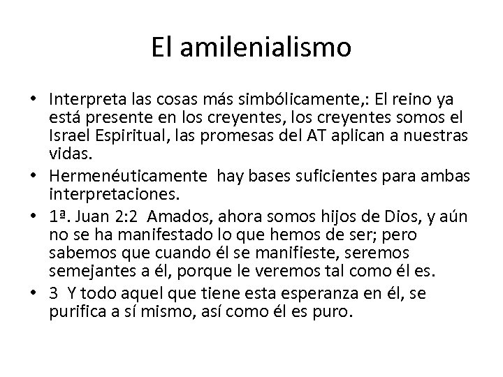 El amilenialismo • Interpreta las cosas más simbólicamente, : El reino ya está presente en los creyentes, los creyentes somos el Israel Espiritual, las promesas del AT aplican a nuestras vidas. • Hermenéuticamente hay bases suficientes para ambas interpretaciones. • 1ª. Juan 2: 2 Amados, ahora somos hijos de Dios, y aún no se ha manifestado lo que hemos de ser; pero sabemos que cuando él se manifieste, seremos semejantes a él, porque le veremos tal como él es. • 3 Y todo aquel que tiene esta esperanza en él, se purifica a sí mismo, así como él es puro.