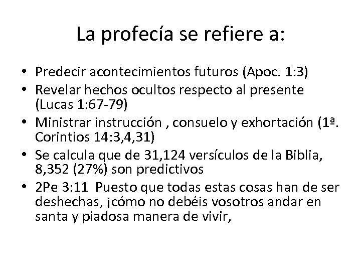 La profecía se refiere a: • Predecir acontecimientos futuros (Apoc. 1: 3) • Revelar hechos ocultos respecto al presente (Lucas 1: 67 -79) • Ministrar instrucción , consuelo y exhortación (1ª. Corintios 14: 3, 4, 31) • Se calcula que de 31, 124 versículos de la Biblia, 8, 352 (27%) son predictivos • 2 Pe 3: 11 Puesto que todas estas cosas han de ser deshechas, ¡cómo no debéis vosotros andar en santa y piadosa manera de vivir,