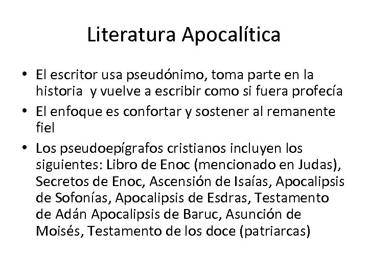 Literatura Apocalítica • El escritor usa pseudónimo, toma parte en la historia y vuelve a escribir como si fuera profecía • El enfoque es confortar y sostener al remanente fiel • Los pseudoepígrafos cristianos incluyen los siguientes: Libro de Enoc (mencionado en Judas), Secretos de Enoc, Ascensión de Isaías, Apocalipsis de Sofonías, Apocalipsis de Esdras, Testamento de Adán Apocalipsis de Baruc, Asunción de Moisés, Testamento de los doce (patriarcas)