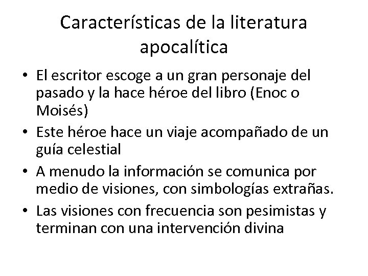 Características de la literatura apocalítica • El escritor escoge a un gran personaje del pasado y la hace héroe del libro (Enoc o Moisés) • Este héroe hace un viaje acompañado de un guía celestial • A menudo la información se comunica por medio de visiones, con simbologías extrañas. • Las visiones con frecuencia son pesimistas y terminan con una intervención divina