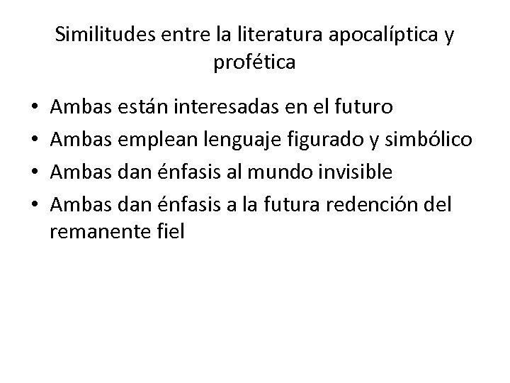 Similitudes entre la literatura apocalíptica y profética • • Ambas están interesadas en el futuro Ambas emplean lenguaje figurado y simbólico Ambas dan énfasis al mundo invisible Ambas dan énfasis a la futura redención del remanente fiel