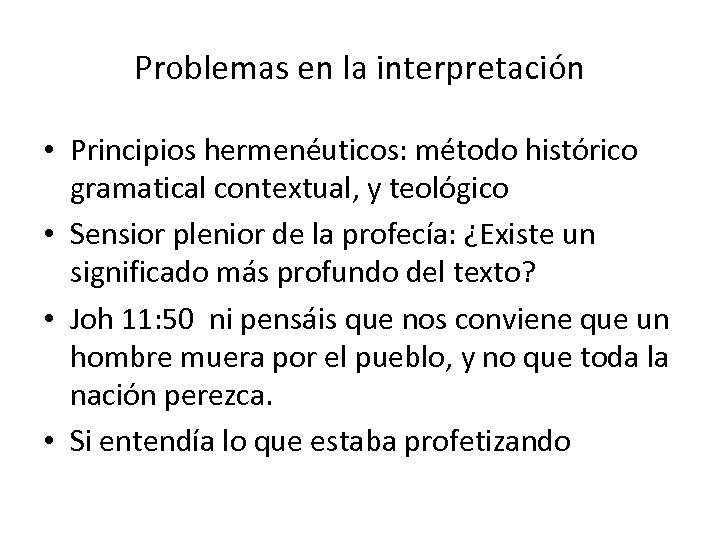 Problemas en la interpretación • Principios hermenéuticos: método histórico gramatical contextual, y teológico • Sensior plenior de la profecía: ¿Existe un significado más profundo del texto? • Joh 11: 50 ni pensáis que nos conviene que un hombre muera por el pueblo, y no que toda la nación perezca. • Si entendía lo que estaba profetizando