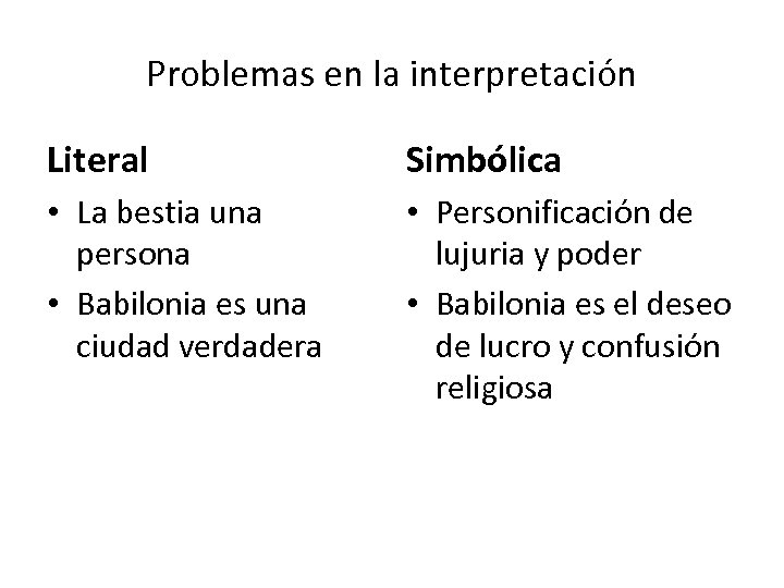 Problemas en la interpretación Literal Simbólica • La bestia una persona • Babilonia es una ciudad verdadera • Personificación de lujuria y poder • Babilonia es el deseo de lucro y confusión religiosa
