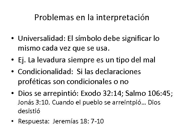 Problemas en la interpretación • Universalidad: El símbolo debe significar lo mismo cada vez que se usa. • Ej. La levadura siempre es un tipo del mal • Condicionalidad: Si las declaraciones proféticas son condicionales o no • Dios se arrepintió: Exodo 32: 14; Salmo 106: 45; Jonás 3: 10. Cuando el pueblo se arreintpió… Dios desistió • Respuesta: Jeremías 18: 7 -10