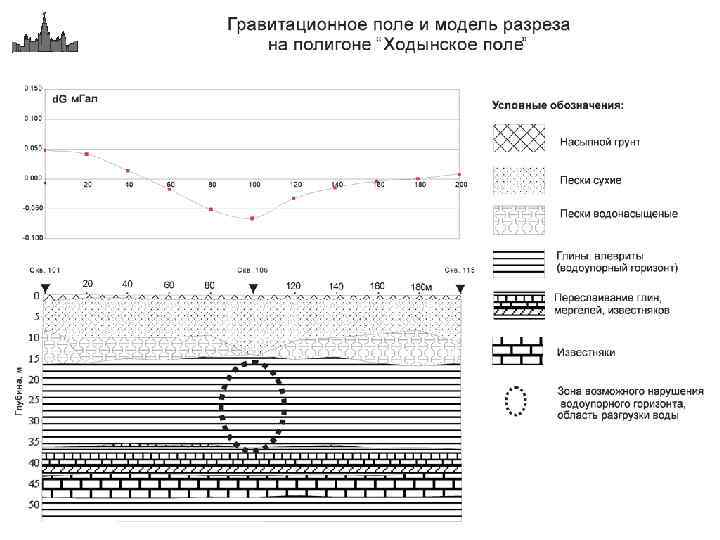 Использование высокоточной гравиразведки для решения инженерно-геологических задач Результаты исследования: а) график gб; б) геологический разрез; в) зона разуплотнения по сецсмическим данным; 1 - аллювиальные отложения надпойм. террас (пески, гравий, суглинки, глины, торф), 2 - гипс-ангидритовая толща, Р 1 s; 3 - номера разведочных скважин; 4 - интервалы частичного поглощения промывочной жидкости; 5 - интервалы полного поглощения промывочной жидкости; 6 - интервалы провала бурового снаряда (полость); 7 - верхняя граница разуплотненных пород; 8 - зона пониженных скоростей продольных волн в обводненных песках и гипсах; 9 - уровень грунтовых вод. По данным Юргина О. В. Каф. геофизики ГОУВПО «Пермский государственный университет» 2006