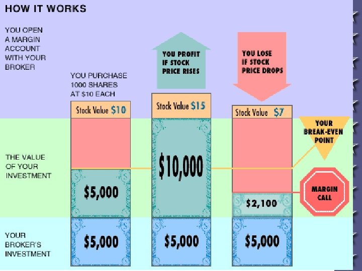 Buying on Margin • If you have $50, you buy 1 share of stock at $50. • The price goes up to $100, you sell • $100 -50 = $50 (profit) • Stock goes down to $25, you sell • $25 -50 = -$25 (loss) • People start to buy on margin- buying stock with as little as %10 down • Now you have $50 and you can buy 10 shares of $50 stock • For each share you put down $5 (10%) and borrow $45 (90%) • Each share goes up to $100. You sell. • $100 - $45 (borrowed $) = $55 - $5 (your investment) = $50 profit per share • $50 x 10 shares = $500 profit • Each share goes down to $25. You sell • $25 -$45= -$20 - $5 = -$25 • -$25 x 10 shares = $250 loss