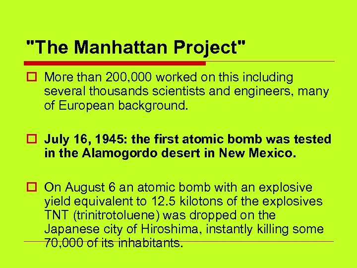"The Manhattan Project" o More than 200, 000 worked on this including several thousands scientists and engineers, many of European background. o July 16, 1945: the first atomic bomb was tested in the Alamogordo desert in New Mexico. o On August 6 an atomic bomb with an explosive yield equivalent to 12. 5 kilotons of the explosives TNT (trinitrotoluene) was dropped on the Japanese city of Hiroshima, instantly killing some 70, 000 of its inhabitants.