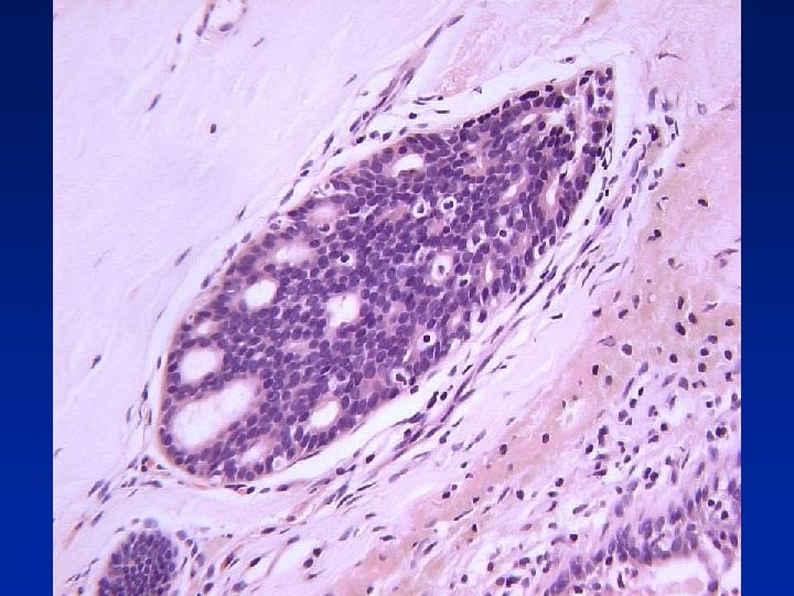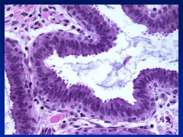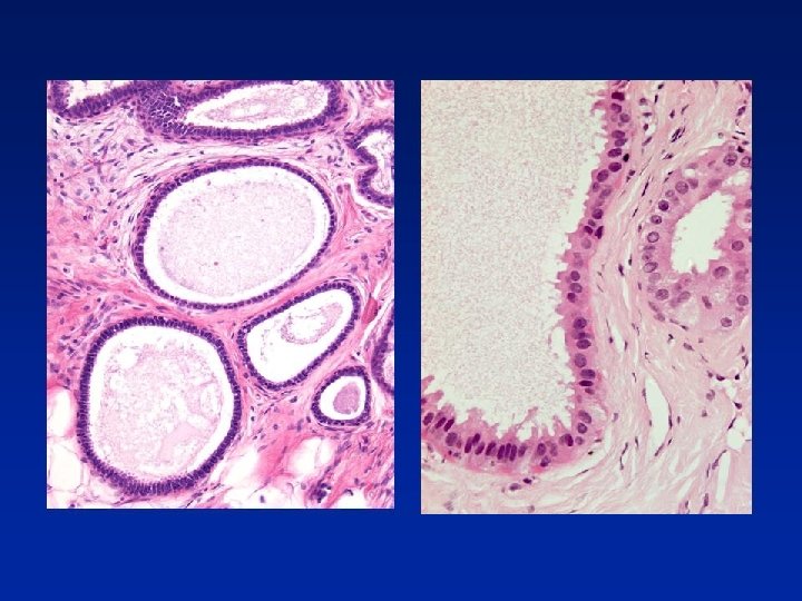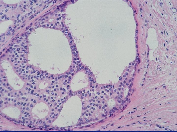 Usual Epithelial Hyperplasia • • Architectural features – Irregular fenestrations – Peripheral fenestrations – Stretched or twisted epithelial bridges – Uneven distribution and overlapping of nuclei Cellular features – Multiple cell types – Variation in appearance of epithelial cells – Variation in appearance of nuclei – Often oval rather than round – Indistinct cell margins