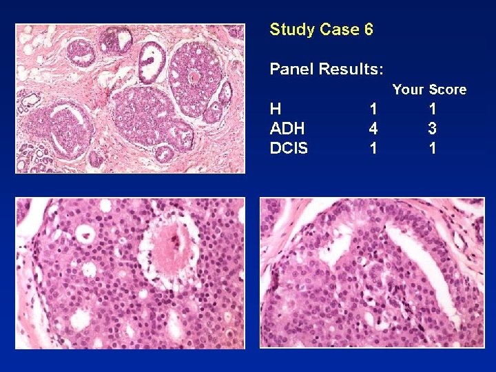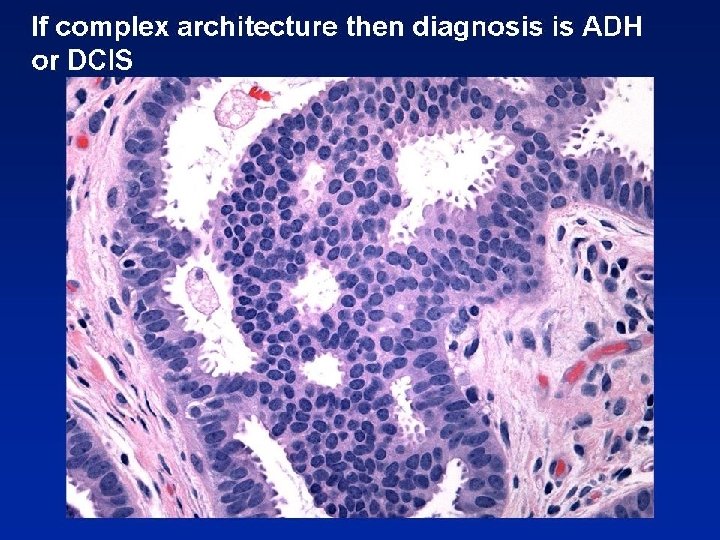 ADH - hints 1. If you have not considered low grade DCIS as diagnosis, then is NOT ADH 2. ADH is small, microfocal lesion - if lesion more than a few mm, then not ADH 3. ADH is clonal, luminal (CK 5 negative, CK 15 negative), uniformly ER positive
