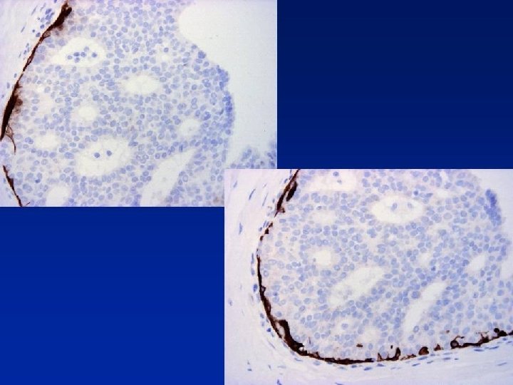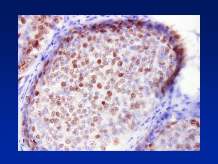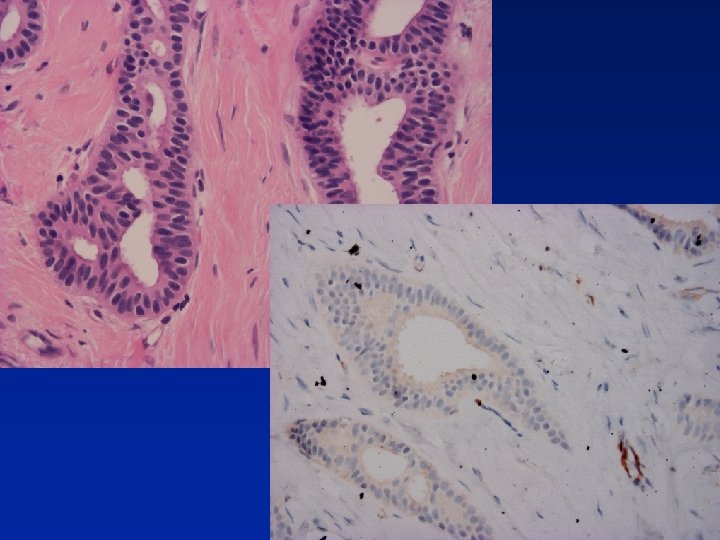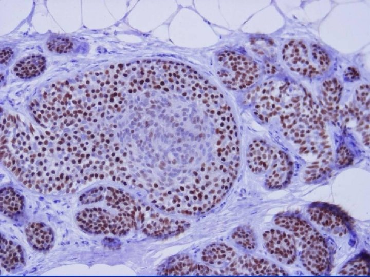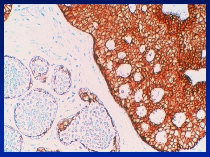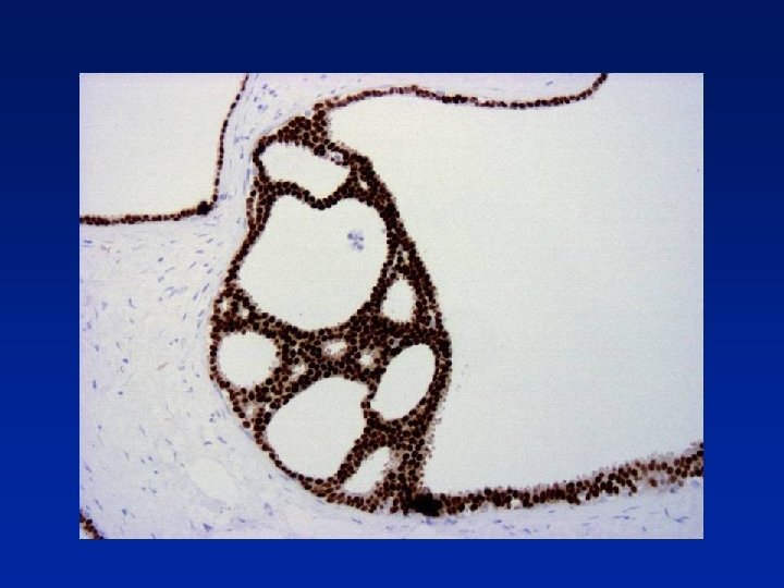 ER in Diagnosis of Intraductal Epithelial Proliferations • % of ER +ve cells slightly increased in UEH • ER +ve surrounded by ER -ve cells or • contiguous groups of +ve cells (sometimes >90% cells) In ADH, LCIS & low grade DCIS contiguous +ve cells Shoker BS et al. J Pathol 1999; 188; 237 -244