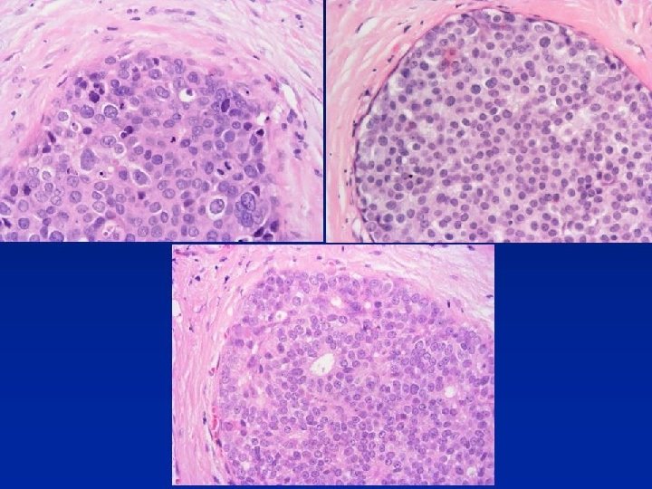 College of American Pathologists’ Guidelines for DCIS Grading Nuclear Grade 1 Monotonous nuclei, 1. 5 to 2. 0 RBC diameters, with finely dispersed chromatin & only occasional nucleoli Grade 2 Neither nuclear grade 1 nor nuclear grade 3 Grade 3 Markedly pleomorphic nuclei, usually greater than 2. 5 RBC diameters, with coarse chromatin & prominent or multiple nucleoli
