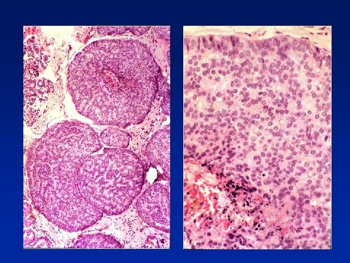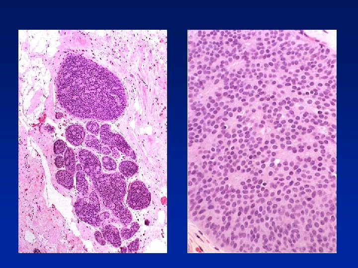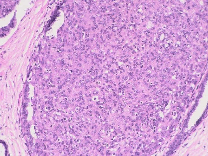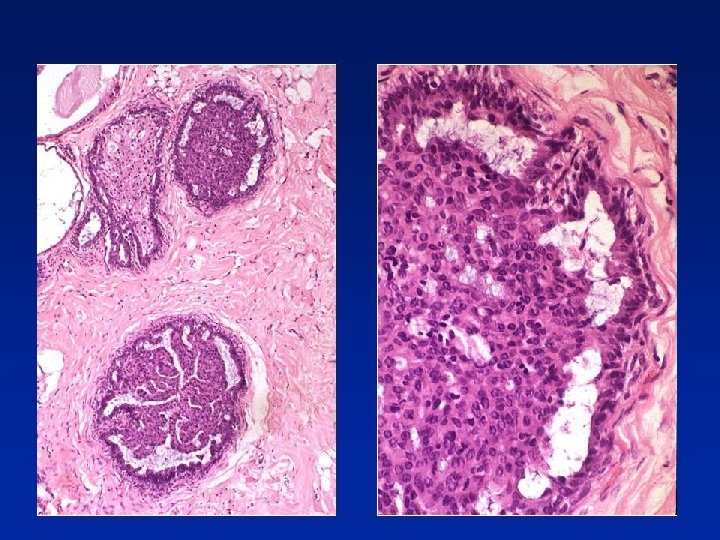 LCIS Vs. Low Grade Solid DCIS • Both processes - filling of membrane-bound spaces by uniform, regularly-placed cells with clear cytoplasm • DCIS - sharply defined cell membranes • LCIS - discohesion • Intracytoplasmic lumina more often in LCIS • Low power view - lobulo-centricity of LCIS, more haphazard lobular & duct distortion in DCIS • If features of both then classify as LCIS & DCIS because of bilateral & precursor risk