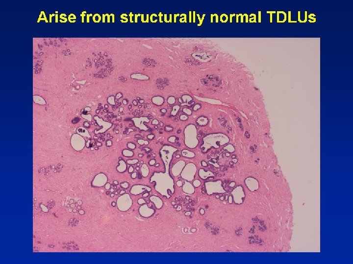 Flat Epithelial Atypia • TDLUs often darker than normal at low power • 1 or more layers of monotonous, cuboidal to • • • columnar cells, resembling LG DCIS Round nuclei Mild increase in nuclear/cytoplasmic ratio Dispersed or marginated chromatin Nucleoli sometimes more prominent Mitotic figures rare May be scattered lymphoid cells
