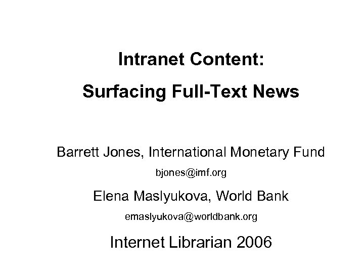 Intranet Content: Surfacing Full-Text News Barrett Jones, International Monetary Fund bjones@imf. org Elena Maslyukova, World Bank emaslyukova@worldbank. org Internet Librarian 2006