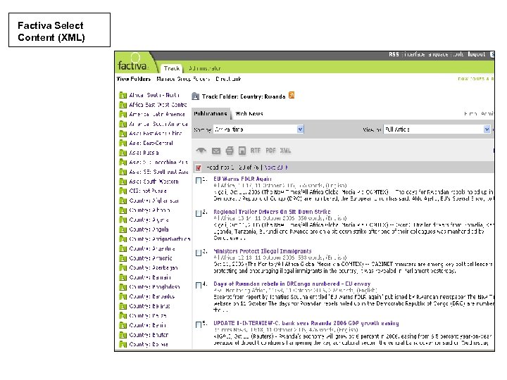 Factiva Select Content (XML) Factiva Select Filters or “Folders” FTP WB repository Folder. ID Internal webpublishing tool Intranet: Rwanda: Left Navigation