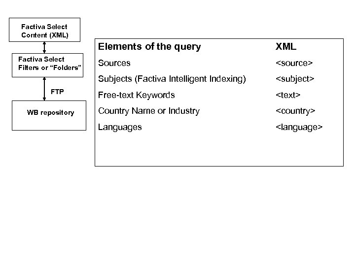 Factiva Select Content (XML) Elements of the query FTP WB repository Sources <source> Subjects (Factiva Intelligent Indexing) Factiva Select Filters or “Folders” XML <subject> Free-text Keywords <text> Country Name or Industry <country> Languages <language>