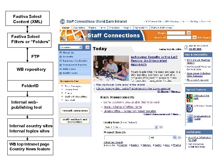 Factiva Select Content (XML) Factiva Select Filters or “Folders” FTP WB repository Folder. ID Internal webpublishing tool Internal country sites Internal topics sites WB top intranet page Country News feature