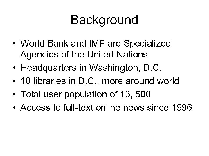 Background • World Bank and IMF are Specialized Agencies of the United Nations • Headquarters in Washington, D. C. • 10 libraries in D. C. , more around world • Total user population of 13, 500 • Access to full-text online news since 1996