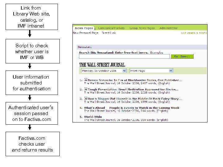 Link from Library Web site, catalog, or IMF intranet Script to check whether user is IMF or WB User information submitted for authentication Authenticated user’s session passed on to Factiva. com checks user and returns results