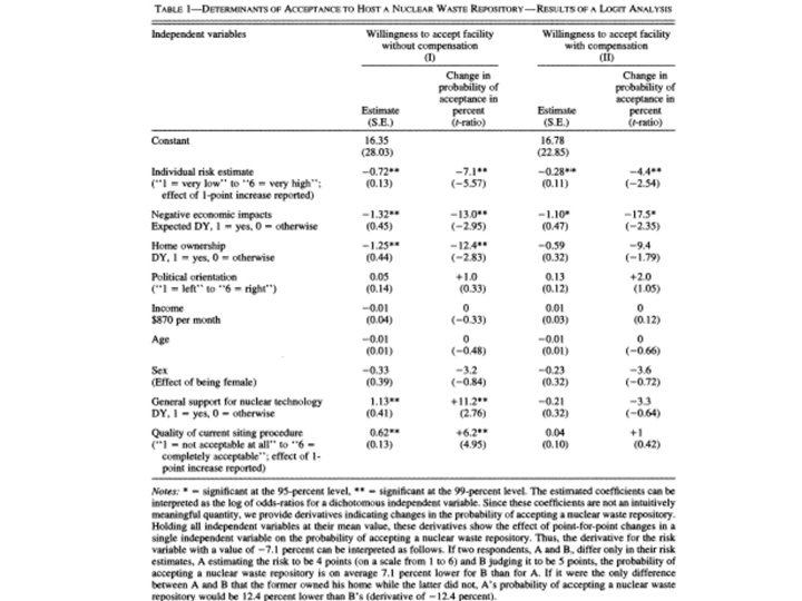 Frey and Oberholzer-Gee (1997, AER) • • Question: Tests reaction to monetary compensation for the acceptance of a nuclear waste repository in their community. Setting: Hypothetical referendum voting question was posed to subjects about if they were willing to permit the construction of a nuclear waste repository in their community. The same question was then repeated with a specific monetary compensation for accepting the nuclear waste repository (varied between $2175, $4, 350 and $6, 525 per individual and year in three sub-samples). Everyone who rejected the compensation then received another question with a higher compensation ($3, 263, $6, 525, or $8, 700). Subjects: 305 interviews of randomly selected subjects in two communities in Switzerland (potential sites for a nuclear waste repository). Results: Fraction of acceptance without monetary compensation: 50. 8%. Fraction of acceptance with monetary compensation: 24. 6% (the amount of compensation had no significant effect on the acceptance probability).