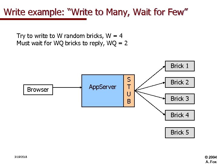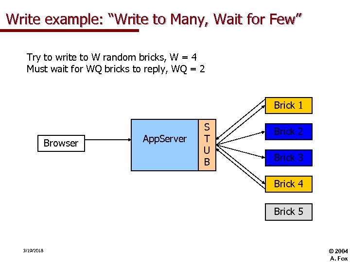 Write example: “Write to Many, Wait for Few” Try to write to W random bricks, W = 4 Must wait for WQ bricks to reply, WQ = 2 Brick 1 Browser App. Server S T U B Brick 2 Brick 3 Brick 4 Brick 5 3/19/2018 © 2004 A. Fox