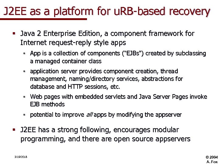 J 2 EE as a platform for u. RB-based recovery § Java 2 Enterprise Edition, a component framework for Internet request-reply style apps § App is a collection of components (“EJBs”) created by subclassing a managed container class § application server provides component creation, thread management, naming/directory services, abstractions for database and HTTP sessions, etc. § Web pages with embedded servlets and Java Server Pages invoke EJB methods § potential to improve all apps by modifying the appserver § J 2 EE has a strong following, encourages modular programming, and there are open source appservers 3/19/2018 © 2004 A. Fox
